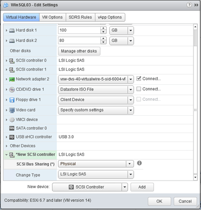 Add new SCSI Controller and choose SCSI Bus Sharing as Physical/Virtual as per your need and click OK.