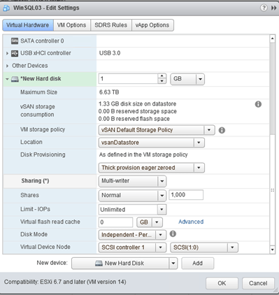 Select Sharing as Multi-writer, Disk Mode as Independent Persistent and Virtual Device Node as SCSI Controller 1 created earlier, click OK