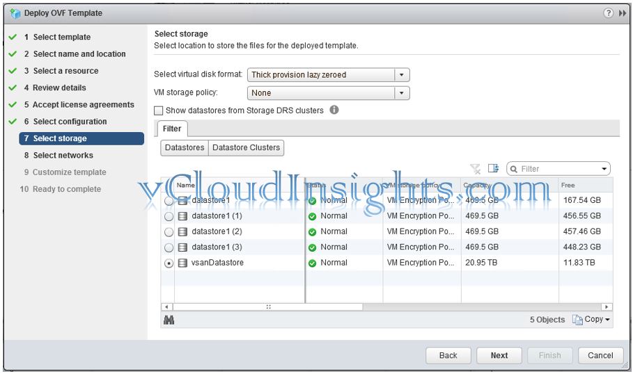 - From dropdown select disk format, storage policy and select storage to install the appliance and click on Next.
