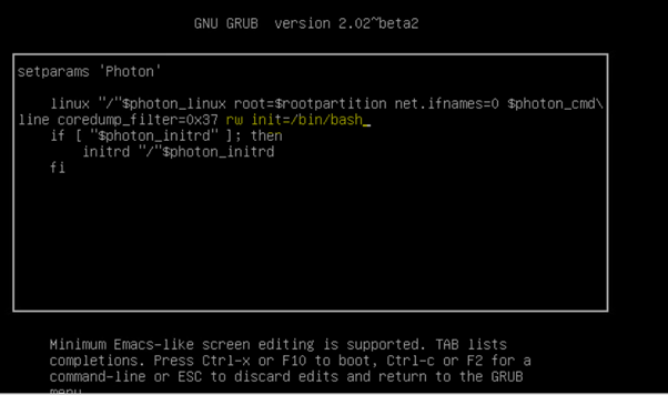 - After the vRLCM Photon OS starts, press e key to enter the GNU GRUB Edit Menu.