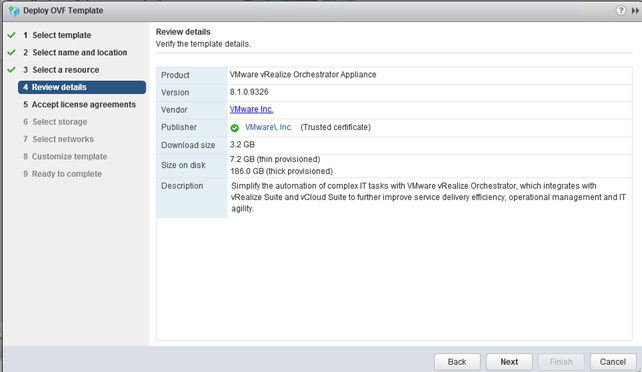 - Review the details of vRealize Orchestrator Appliance and click Next