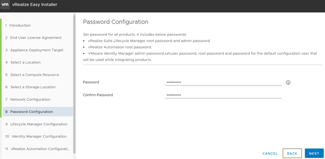 Configure password and move Next. This password is for all the product include vRSLCM root password & admin password, vRA root password,