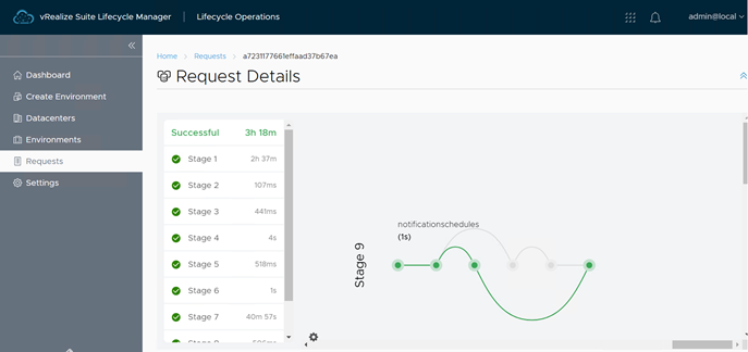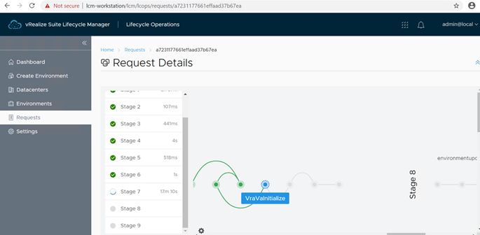So, I logged in to the vRSLCM appliance for the URL provide in the progress windows and from ‘Request’ tab we can check what is the error in details and can fix it & retry the deployment. Complete process can be monitored from here.