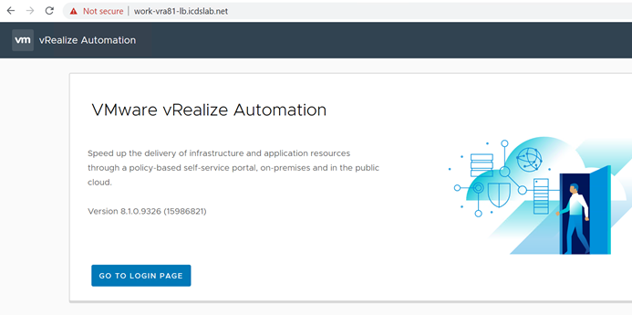 Once the deployment is successful, validate the installation by opening the https://vRA LB FQDN/IP . Click on ‘Go To Login Page and it will