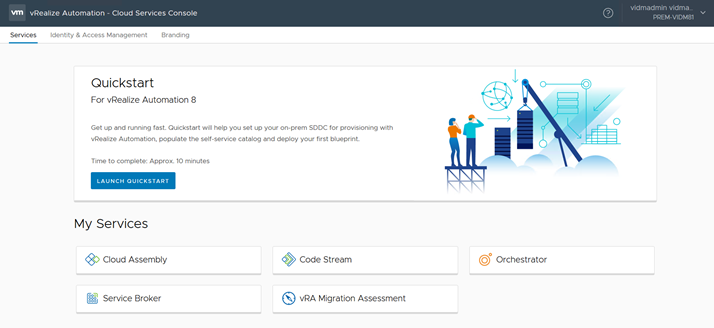 From the console, you can access the new vRealize Automation QuickStart & My services. QuickStart will help us to setup our on-prem SDDC