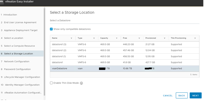 Select datastore from storage location and check/uncheck “Enable Thin Disk Mode” as per your requirement. Move next