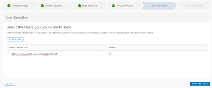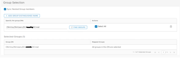 - Specify the group DN to sync with vIDM, vRA and click on Find Group. Search & select the group you wish to sync and click on Save and Next.