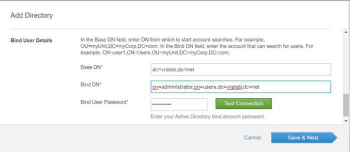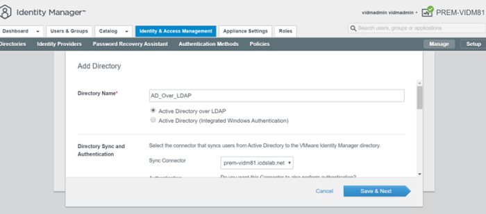 - In Add Directory page, give details like Directory Name and choose Active Directory over LDAP, choose Sync Connector from drop down (in case of clustered vIDM) and Bind User details and hit Test Connection, once connection is successful click on Save & Next.