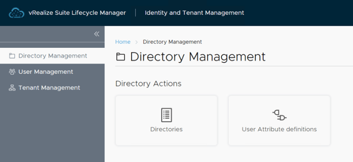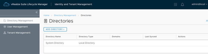 - Directory Service Integration via vRealize Suit Life Cycle Manager, Identity and Tenant Management