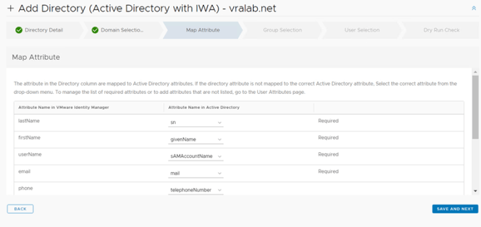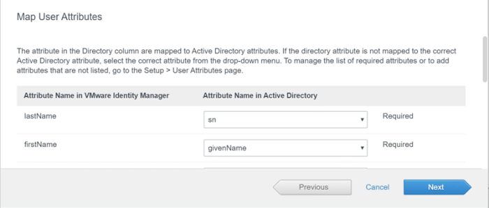 - In Map Attribute window, map the VMware Identity Manager attribute with Active Directory attribute. And click on Save and Next.
