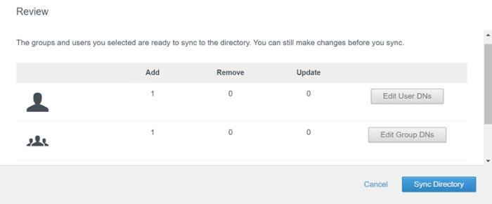 - In Review page it will show you summary of user & group going to sync click on Sync Directory. You can view the Sync log from “Import Status: Sync started” popup window.