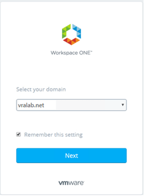 - Once click on Login With Identity Manager you will be direct to Workspace ONE login page, from here you can select the domain added and click on Next.