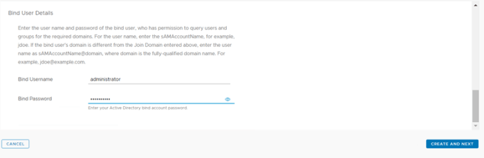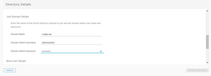 - In Directory Detail page fill the details like Directory Name, select connector, Join Domain Details and Bind User Details and click on Click and Next.