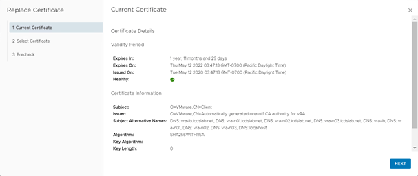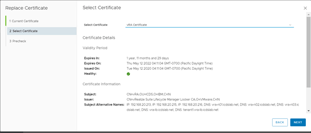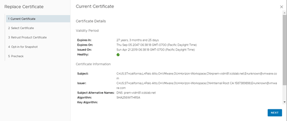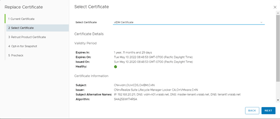 In the select Certificate page select the vIDM certificate create earlier. Once you will select the certificate it will show all the details of certificate. Click Next to move forward.