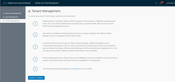 Go to Identity and Tenant Management Tenant Management and click Enable Tenancy