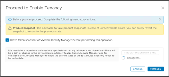 Proceed to Enable Tenancy window will give you an opportunity to take snapshot of VMware Identity Manager.