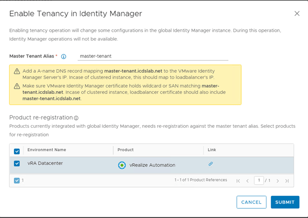 Now, provide Master Tenant Alias and select the product to re-register against the master tenant alias and Submit.