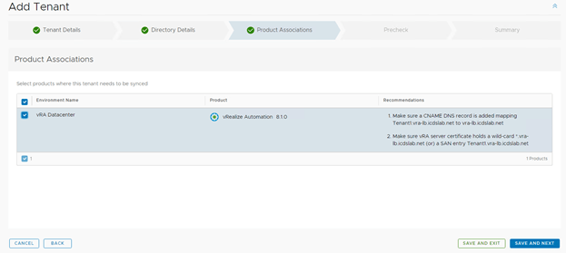 In Product Association page select all product you want to sync with tenant, in my case only vRA 8.1 is deployed.