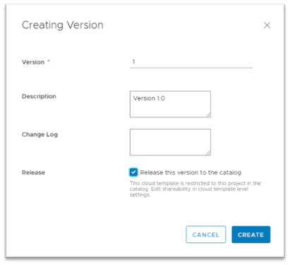 4. Enter a description if required and check Release this version to the catalog and click on Create