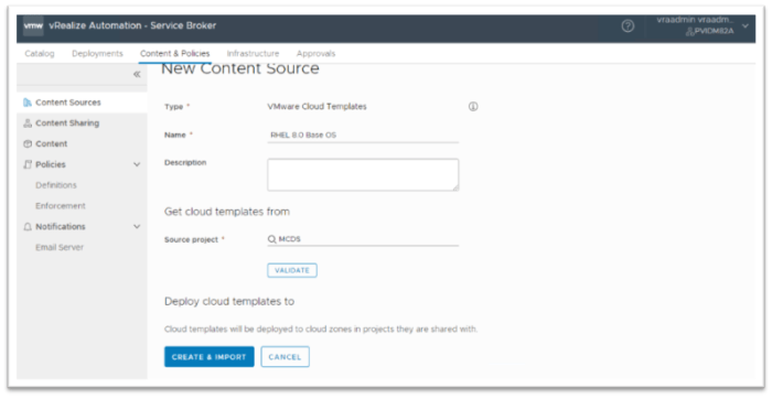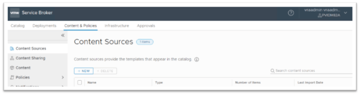 6. Click on Service Broker > Content & Policies tab > Content Sources > click on New and select the VMware Cloud Template