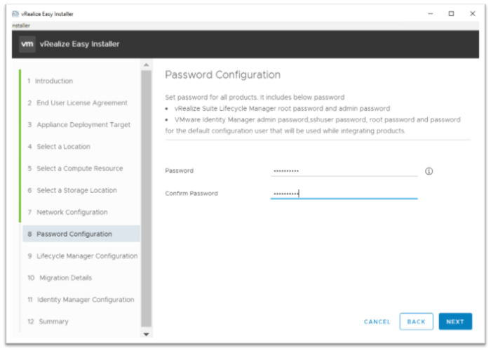 8. In the Password configuration, enter the password which can be set to the vRealize Suite Lifecycle Manager root and admin password.