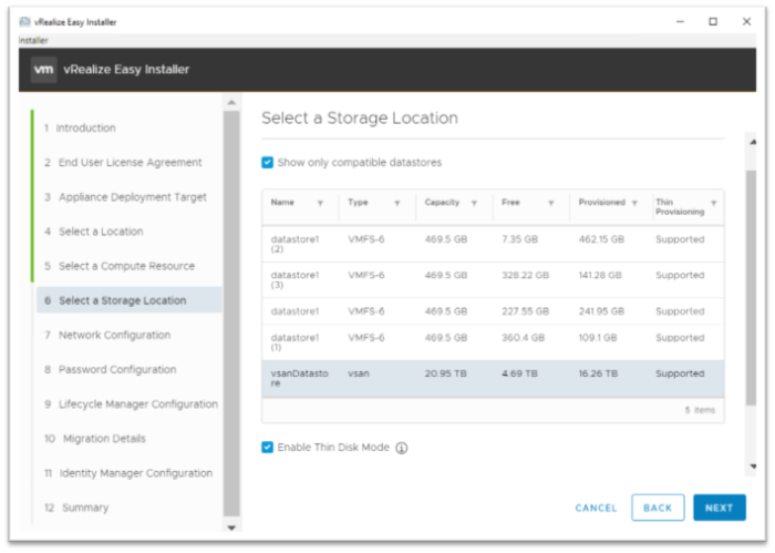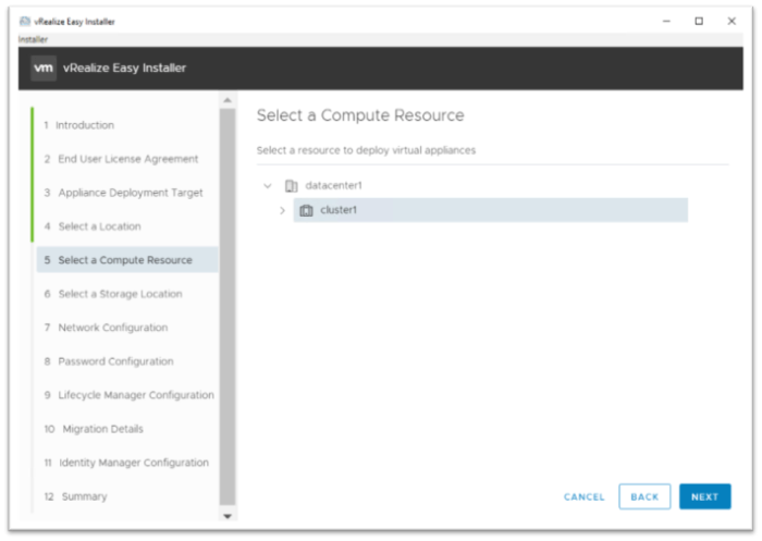 6. Select the datacentre, Compute Resource and Storage in the vCenter Server.