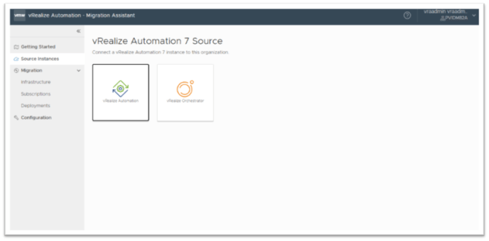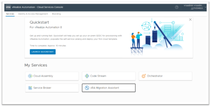 1. Login to vRealize Automation 8.2 with a user having migration service administrator permission and click on vRA Migration Assistant.