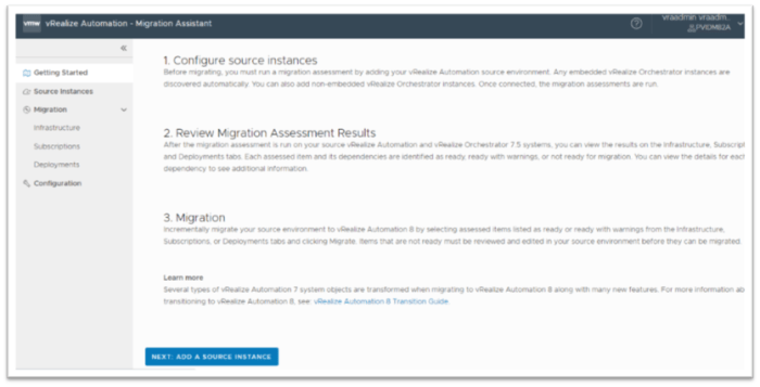 - Log user in to vRealize Automation 8 to see the Migration Assessment tile.