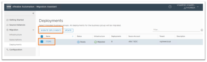 1. In the deployment tab select business group and click on MIGRATE DEPLOYMENTS.