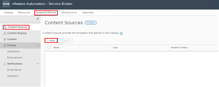 - Select Content and Policies > Content Sources Click New.