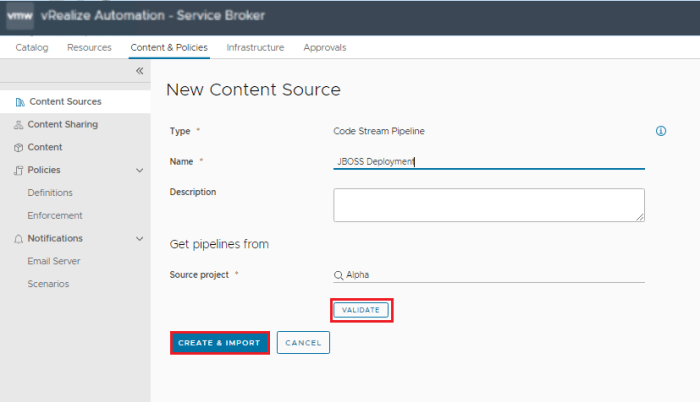 - Click on Code Stream Pipelines, Enter the Name for this content source.
