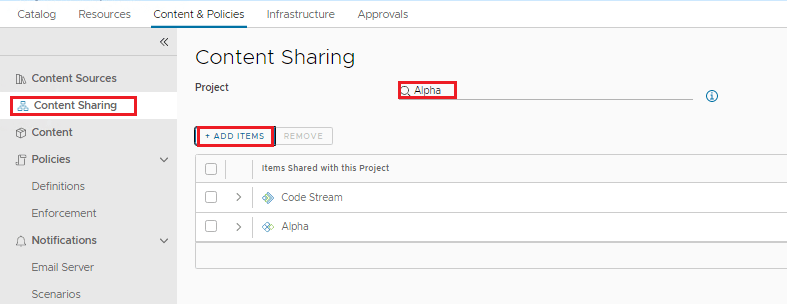 - Click Add Items and then select one or more pipelines to share with the project.